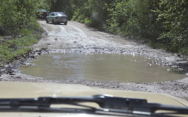 Die Straßen sind am Westufer des Ladogasees deutlich schlechter als am Ostufer! Die Baustellen sind tlw. ein Wahnsinn, Absicherung? Fehlanzeige. Straße kann man die Wege in den Baustellen auch nicht nennen und so freuen wir uns mehrfach, dass wir ein offroadtaugliches Gespann haben. Die Asphaltstraße endet auch plötzlich im Nirgendwo und vor uns liegen einige Kilometer Gatsch-, Sand-, „irgendwas“Piste. Auch Wasserdurchfahrten sind dabei und wieder freuen wir uns über unser Gespann, dass wir zumindest damit keine Probleme haben und doch halbwegs gut vorankommen.